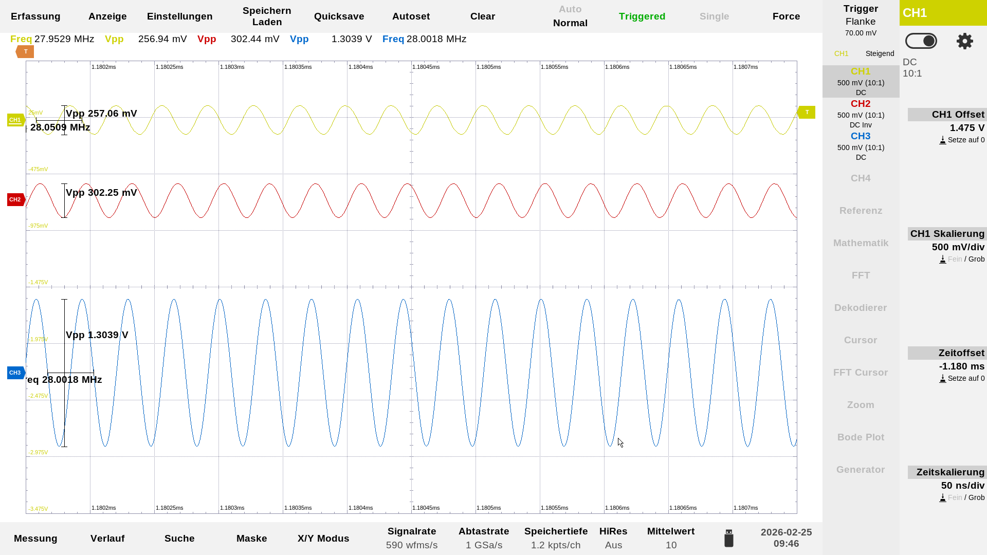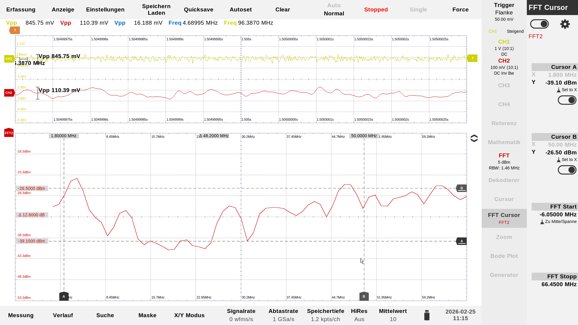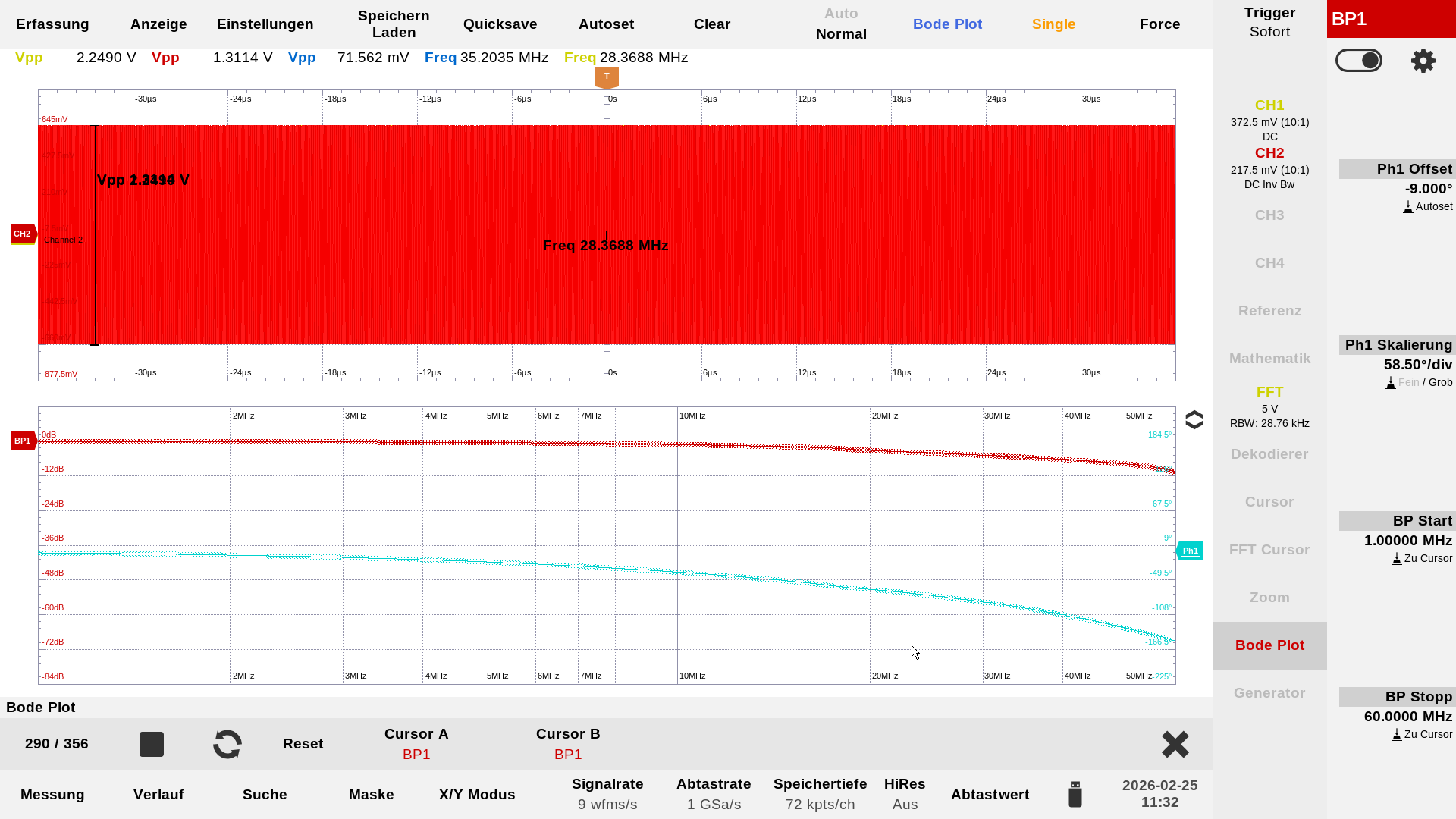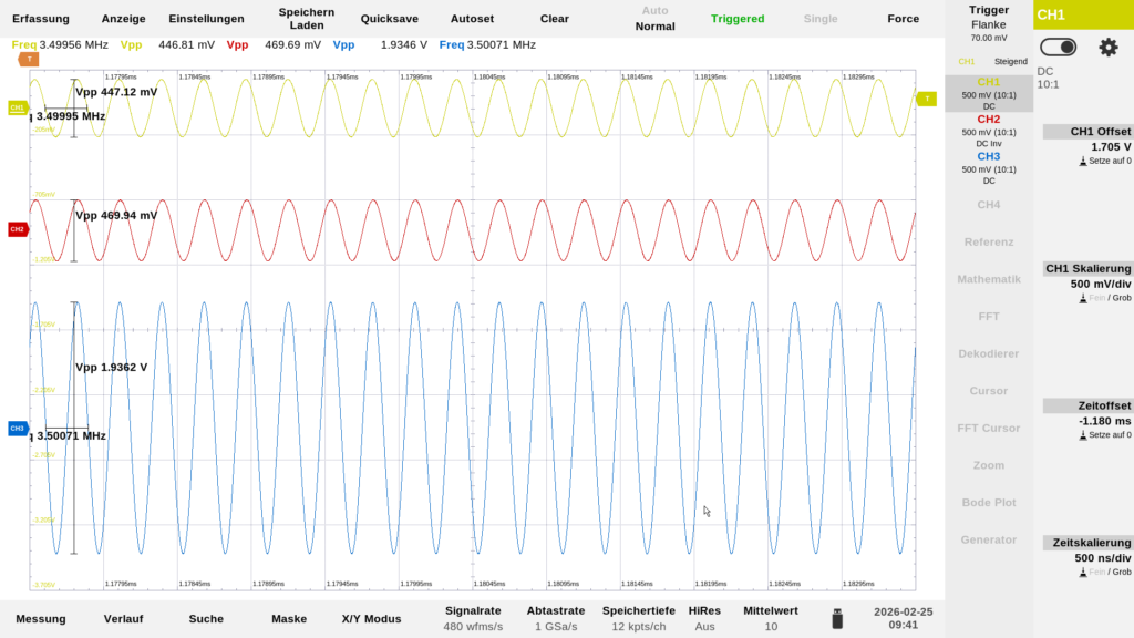 …zwei komplett bestückte Stack-Baluns gegeneinander geschaltet. Von rechts nach links: die Einspeisung vom RF-Signalgenerator mit 0 dBm, Messauskopplung vor dem Balun, 1ter + 2ter Stack-Balun, Messauskopplung hinter den Baluns, nicht mehr sichtbar der 50 Ohm Abschlusswiderstand. Die Farbe der Tastköpfe entsprechen auch den Farben der einzelnen Kurven in der Darstellung auf dem Oszilloskop. In der Mitte ist eine Probe mit blauer Kennzeichnung angeklemmt, das ist die Sekundärwicklung des Baluns.…2 x 10 Windungen nebeneinander, das ist der neugewickelte Balun mit dem die folgenden Messungen erzeugt wurden.…hier sind nur 2 Baluns bestückt, nicht bestückte Plätze müssen mit einer Drahtbrücke überbrückt werden.…oder auch nur eine bestückte Position. Die beiden weißen Verbindungdrähte sind dann in der Praxis die Primärseite. Hier noch potential getrennt…man kann aber problemlos auch eine Seite mit an Masse legen, dann ist das Teil unsymmetrisch, und die Antenne selber ist dann über das Koaxielkabel geerdet.…das war die erste Messung des Übertragungsverhalten mit einem breitbandigen Rauschen aus einer Rauschquelle…da wusste ich aber noch nicht das ein Balun eine kalte Lötstelle hatte.…das sieht schon besser aus!…Aufgenommen wurde die Kurve mit der PodePlot-Funktion des Magnova Oszilloskops. Eingestellt war: 1,0 MHz -60 MHz, 2Vpp. Mit diesen Einstellungen sind auch die folgenden Kurven entstanden. Die blaue Kurve zeigt immer das Phasenverhalten.…Übertragungskurve mit 3 bestückten Baluns.…Übertragungskurve mit 2 bestückten Baluns.…und hier die Übertragungskurve mit einem bestückten Balun.…Übertragungsverhalten bei 3,5 MHz, gelb = Eingang, rot = hinter den beiden Baluns, blau = Signal an der Primärseite – hier zwischen den beiden Baluns gemessen.…Übertragungsverhalten bei 28,0 MHz.