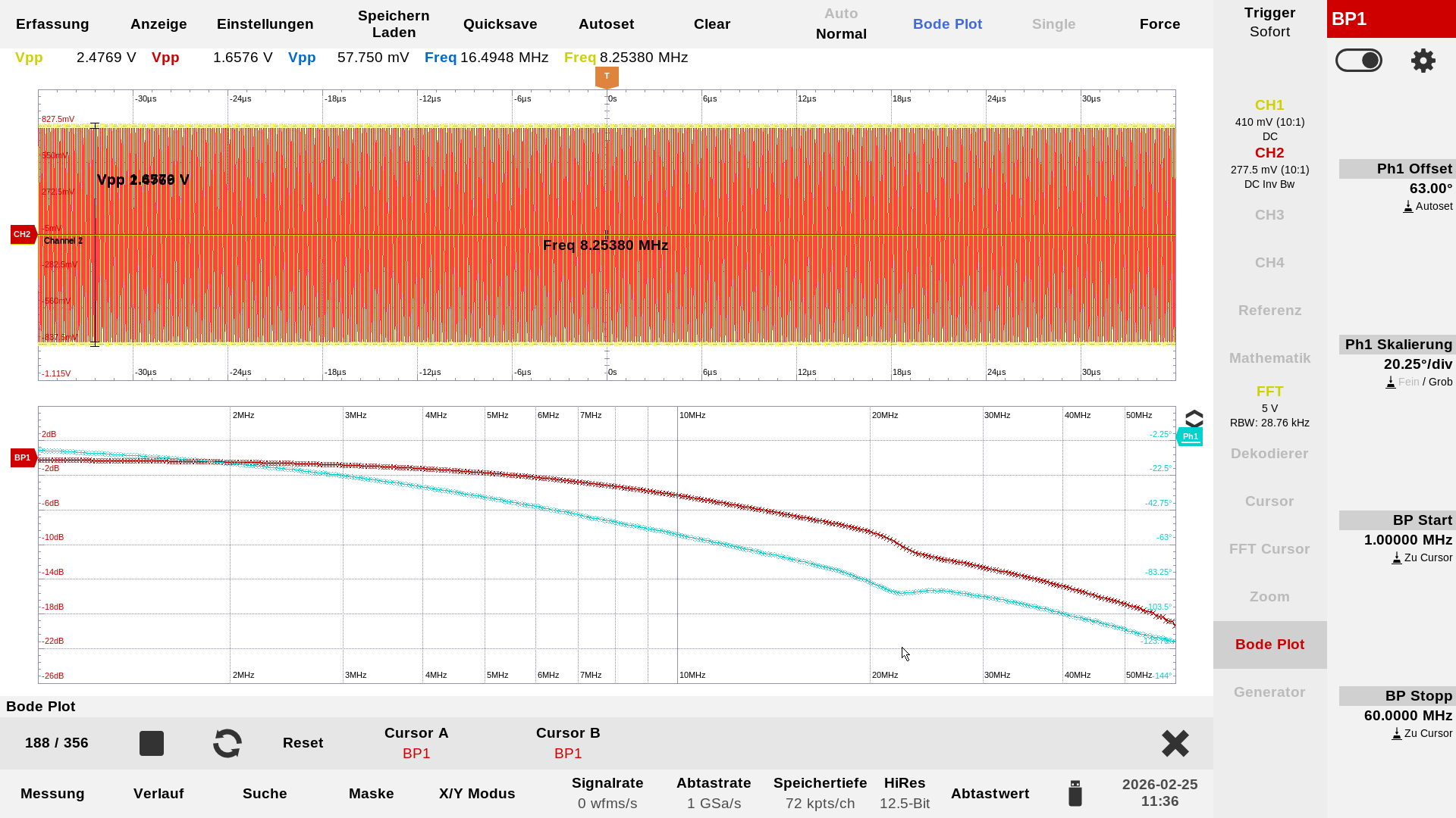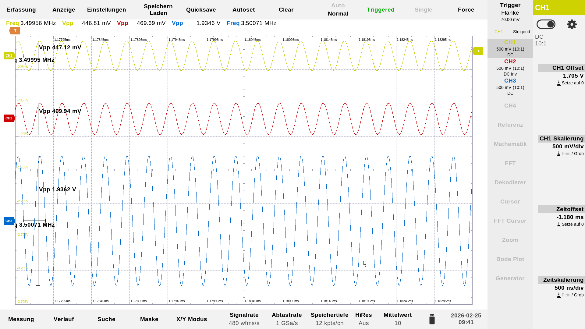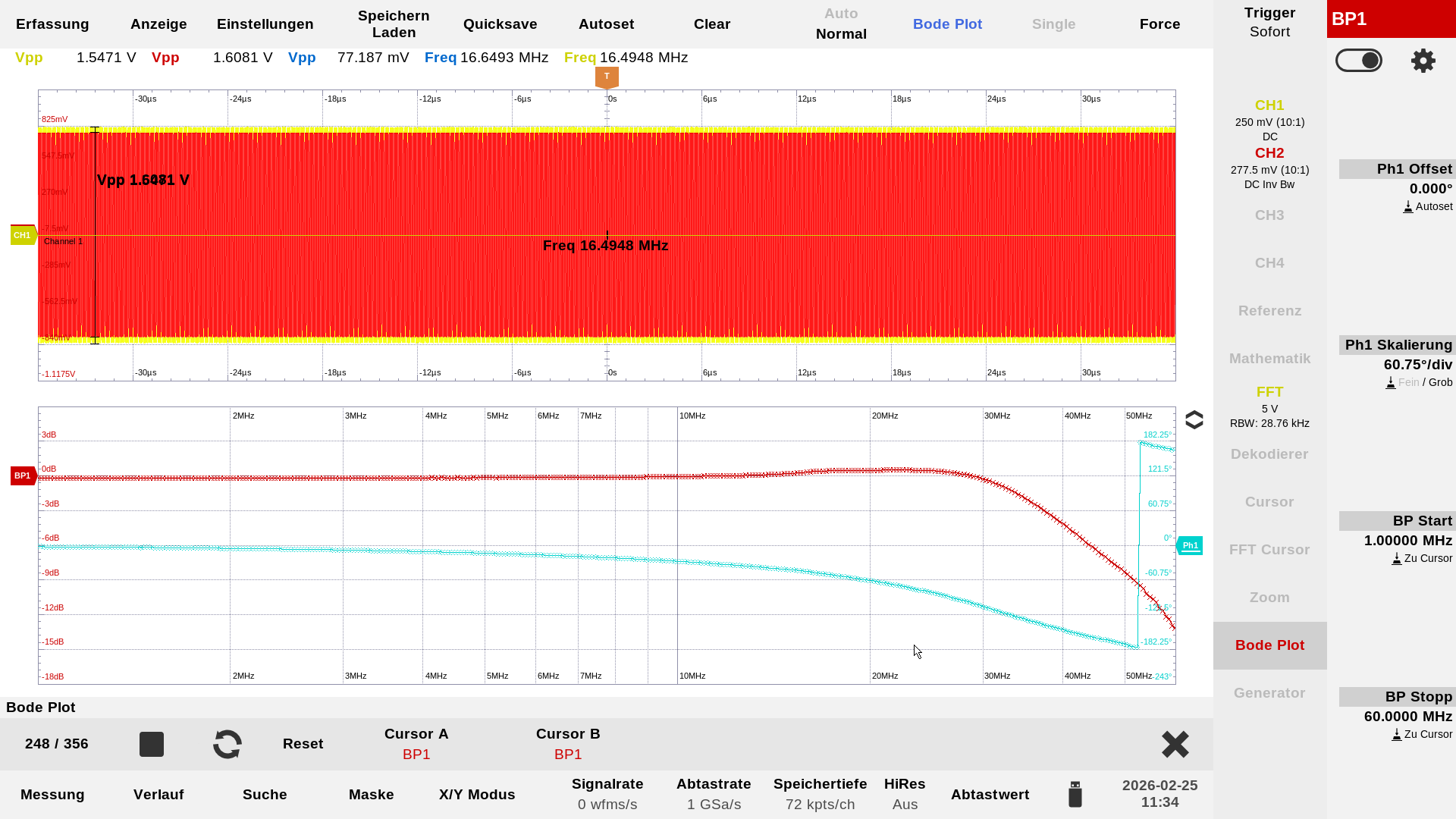 …zwei komplett bestückte Stack-Baluns gegeneinander geschaltet. Von rechts nach links: die Einspeisung vom RF-Signalgenerator mit 0 dBm, Messauskopplung vor dem Balun, 1ter + 2ter Stack-Balun, Messauskopplung hinter den Baluns, nicht mehr sichtbar der 50 Ohm Abschlusswiderstand. Die Farbe der Tastköpfe entsprechen auch den Farben der einzelnen Kurven in der Darstellung auf dem Oszilloskop. In der Mitte ist eine Probe mit blauer Kennzeichnung angeklemmt, das ist die Sekundärwicklung des Baluns.…2 x 10 Windungen nebeneinander, das ist der neugewickelte Balun mit dem die folgenden Messungen erzeugt wurden.…hier sind nur 2 Baluns bestückt, nicht bestückte Plätze müssen mit einer Drahtbrücke überbrückt werden.…oder auch nur eine bestückte Position. Die beiden weißen Verbindungdrähte sind dann in der Praxis die Primärseite. Hier noch potential getrennt…man kann aber problemlos auch eine Seite mit an Masse legen, dann ist das Teil unsymmetrisch, und die Antenne selber ist dann über das Koaxielkabel geerdet.…das war die erste Messung des Übertragungsverhalten mit einem breitbandigen Rauschen aus einer Rauschquelle…da wusste ich aber noch nicht das ein Balun eine kalte Lötstelle hatte.…das sieht schon besser aus!…Aufgenommen wurde die Kurve mit der PodePlot-Funktion des Magnova Oszilloskops. Eingestellt war: 1,0 MHz -60 MHz, 2Vpp. Mit diesen Einstellungen sind auch die folgenden Kurven entstanden. Die blaue Kurve zeigt immer das Phasenverhalten.…Übertragungskurve mit 3 bestückten Baluns.…Übertragungskurve mit 2 bestückten Baluns.…und hier die Übertragungskurve mit einem bestückten Balun.…Übertragungsverhalten bei 3,5 MHz, gelb = Eingang, rot = hinter den beiden Baluns, blau = Signal an der Primärseite – hier zwischen den beiden Baluns gemessen.…Übertragungsverhalten bei 28,0 MHz.