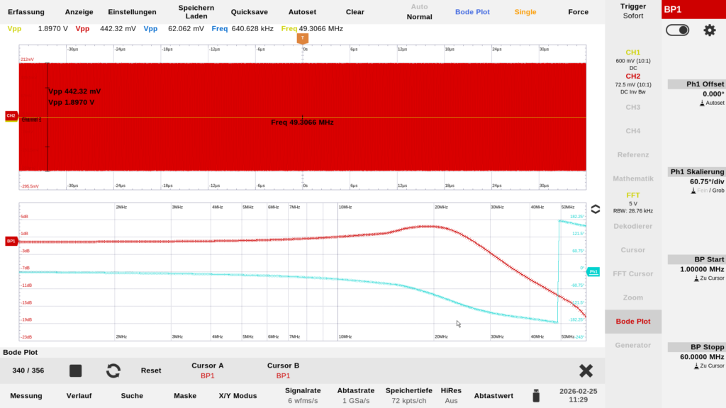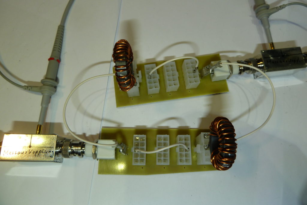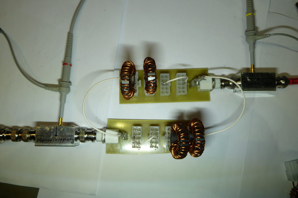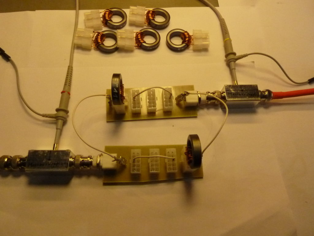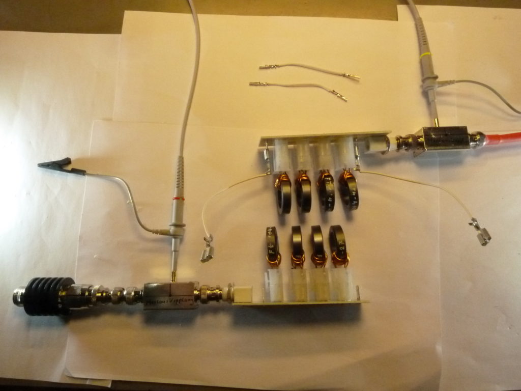 Die Messungen werde ich später nachlegen. Meine Erwartungen an dieser Art von Balun haben sich aber erfüllt und ich glaube/hoffe das noch großes Potential für Verbesserungen vorhanden ist…eine davon ist die Wickelmethode anpassen! Soviel hat sich aber bei den ersten einfachen Messungen mit dem Oszilloskop zwischen 10 MHz und 25 MHz gezeigt: ein fast linearer Frequenzgang mit fast keinen Verlusten und das bei einem Messaufbau von 2 in Reihe geschalteten Systemen. Unter 10 MHz und über 25 MHz nehmen die Verluste allerdings zu und sind als Pegelverlust im Oszillogramm direkt festzustellen.