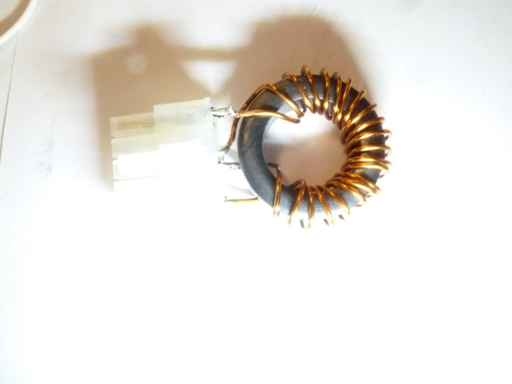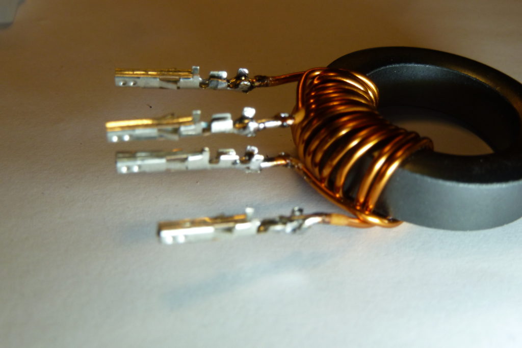 Bei Reichelt habe ich mir ein Stecksystem bestellt was meinen Ansprüchen genügt mit dem ich ausreichend flexibel bin: Die Bauteile sind von MOLEX: MOLEX 39281103, MOLEX 39012100 + MOLEX 39000066, kosten zusammen ca. 16 €. Bei dem Bewickeln der Baluns habe ich gespart, was sich als Fehler rausstellte. Ich habe hier ein spartanische Wickelmethode realisiert: Jeder Balun besteht aus einer primär-und einer sekundär Wicklung mit je 7 Windungen. Die Wicklungen sind eng aneinander liegend auf engstem Raum auf einen FT114-43 Kern gewickelt. Ich erhoffte dadurch eine besonders gute Kopplung zwischen primär-und sekundär Kreis zu bekommen. Das ist aber nur zum Teil so. Erste Messungen haben ergeben das der gestackte Balun sehr gut funktioniert, der Balun ist aber nicht sehr breitbandig. Ich hätte die Wicklungen gleichmäßig über den Kern verteilen müssen bzw. meine Spezialwickelmethode anwenden sollen, wie in einem anderen Artikel beschrieben. Ich versuche das noch zu korrigieren, es werden noch weitere Experimente folgen. Das Bewickeln der Baluns mit 1,0 mm Draht hat keine 2 Stunden gedauert, danach taten mir aber die Finger weh, ein dünnerer Draht wäre für dieses Experiment sinnvoller gewesen…hatte ich aber nicht. Beim Nachbauen mit dem Steckersysetem von MOLEX sind einige Sachen zu beachten, die bestellten Hülsen von MOLEX sind an sich zum Verpressen gedacht wurden aber von mir nur angelötet. Das ist überhaupt kein Problem. Man muss aber die Hülsen in der richtigen Position anlöten weil sie sich nur in einer Richtung in den Stecker einführen lassen, einmal drin ist vorbei. Ohne passendes Ausdrückwerkzeug bekommt man die Dinger nicht mehr raus. Die nachfolgenden Bilder sollen das Problem verdeutlichen.