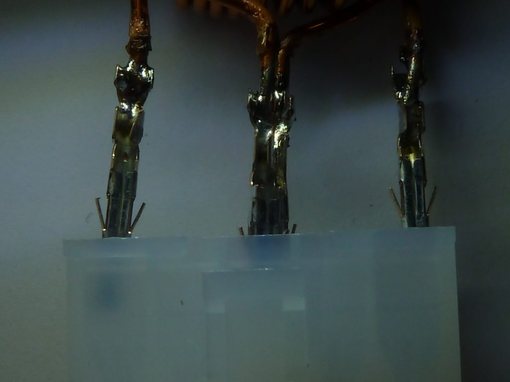 …in dieser Position krallen sich die Hülsen im Stecker fest.…die Anschlussdrähte dürfen ruhig ein bisschen länger sein als wie sie auf dem Bild zu sehen sind. Die Hülsen tauchen sehr tief in den Stecker ein…da kann ein zu kurzer Draht zum Problem werden, bei mir ging es gerade so!