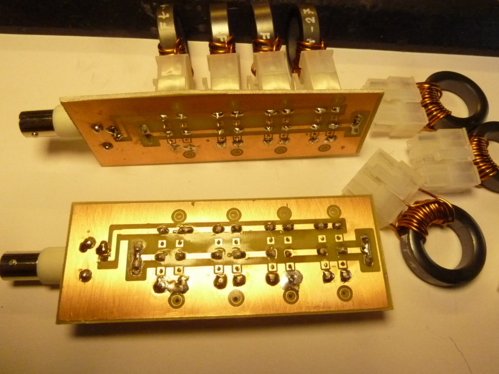 Auf den Testplatinen ist Platz für 4 Baluns. Je nach Bedarf werden 1-4 Positionen bestückt. Die nicht benötigten Stecker werden mit einer Kurzschlussbrücke überbrückt. Eingang vom Funkgerät kommend ist eine BNC-Buchse, der Ausgang endet auf 2 Flachstecker 6,3 mm wie sie im Automotiv-Bereich Verwendung finden. Im nachfolgenden Bild ist mein Testaufbau zu sehen. Hier wurden 2 Platinen gegeneinander geschaltet um so am Ausgang mit einem 50 Ohm Abschlusswiderstand arbeiten zu können, was dazwischen passiert ist irgendwas von 50 Ohm oder höher. Da aber bei der Messung immer 2 gleich bestückte Platinen gegeinander geschaltet sind sollte sich das bei den Messungen mit unterschiedlichen Übertragungsverhältnissen nicht negativ auswirken. Das habe ich auch schon bei anderen Messungen so gemacht und ist ausreichend genau. Den Abschluss mit irgendwelchen ohmschen Widerständen zu machen ist eher unsicher. Letztendlich bestimmt die angeschlossene Antenne die richtige Funktion und die kann voller Tücken sein. Deshalb auch meine Idee zu den gestackten Übertragern, durch diese sollte eine gute Anpassung gelingen!