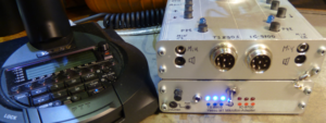 Ja, alles funktioniert. Oben auf dem Gerät 2 PTT-Taster mit Led-Kontrolle. Jeweils 6 Direktmenü-Taster. Hinter dem Schwanenhals 2 Pegelregler für die beiden Mikrofone und einem Umschalter mit welchem man die Mikrofone auf eine Hör-Sprechgarnitur umschalten kann. Auch die Originalmikrofone kann man ohne weitere Maßnahmen an die Front anschließen und damit Betrieb machen. Die Rückseite ist pickepackevoll mit Anschlüssen. Zwei Anschlüsse zu den beiden Funkgeräten. Zwein Anschlüsse von den Kpfhöreranschlüssen der beiden Funkgeräte. Zwei Anschlüsse für Fußtaster. Eine externe Stromversorgung gibt es nicht, das Gerät versorgt sich selber aus dem vom Funkgeräte zur Verfügung gestellten Spannung. Der Strom darf nur wenige Milliampere betragen reicht aber für diese Anwendung völlig aus. Die PTT-Taster haben ein Besonderheit. Bei kurzem Antippen wird auf „Hold“ geschaltet, erst ein neues tasten schaltet wieder zurück, das hat sich als sehr nützlich erwiesen, das sollte auch bei kommerziellen Geräten immer so sein. Bei den Fußtastern musste ich diese Möglichkeit abschalten. Wie schnell ist man mal kurz an die „Treter“ gekommen und gar nicht mitbekommen das das Gerät auf Sendung geht, wie peinlich! Auf dem 2. Bild sieht man aber 2 gleiche Gehäuse übereinander. Das ist dann doch noch eine Erweiterung die erst vor kurzem realisiert habe. Ich hatte das Bedürfnis mal wieder was zu Basteln und wollte ein Hochwertiges Mikrofon anschließen. Yaesu M1 war mein Kandidat. Ich konnte nirgends nachlesen ob je mal ein OM dieses Mikro an Kenwood oder Icom Geräten angeschlossen hat. Damit stand fest das muss ausprobiert werden, auch auf die Gefahr hin das ich viel Geld für einen dann doch nutzlosen Gegenstand ausgebe. Aber es hat funktioniert. Aber aufpassen, Icom verwendet Electret-Kapseln und stellt dafür eine 5 Volt BIAS Spannung zur Verfügung. Kenwood stellt für die Elektronik im Mikrofon 8 Volt zur Verfügung. Außerdem hat Electret eine höhere Ausgangsspannung. Alles das musste berücksichtigt werden. In diesem neuen Teil habe ich dann auch zum ersten Mal mit 1:1 Übertragern gearbeitet die es bei eBay recht günstig in 10er Stückzahlen zu kaufen gibt. Ein Umschalter wurde eingebaut mit dem man zwischen den „Funken“ wählen kann. Auch eine kleine 3,5mm Klinke mit Pegelregler wurde vorgesehen um ein zusätzliches Audiosignal einzuspeisen. Funktioniert aber noch nicht zufriedenstellend, ist viel zu leise, da muss ich noch einmal ran. Alle Mikrofone funktionieren auch gleichzeitig. Eine Beeinflussung der beiden Funkgeräte untereinander wurde bisher nicht festgestellt.