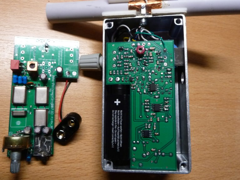 Als Grundlage dienen Unterlagen von DL2AVH. Allerdings verwendet DL2AVH eine gedruckte Rahmenantenne. Ich habe mich mit einem Ferritstab von BOX 73 beholfen, der ist günstig zu bekommen, man muss das Material „4B“ nehmen (FS150-8-4B), andere Materialien sind eher ungeeignet. Auch bekommt man dort die abgeschirmte 3, 3µH Spule für den Oszillator (FI-4-7 4µH). Ob Rahmenantenne oder Ferritstab…da gehen die Meinungen auseinander. Die Rahmenantenne hat einen bessere Richtwirkung ist aber auf Grund der Abmessungen im Gelände eher störend wenn es ins Gehölz geht. Ich wollte eine möglichst kleine Bauweise anstreben mit allen Bauteilen auf der Platine so dass es keinen zusätzlichen Verdrahtungsaufwand gibt. Das ist mir auch gelungen, allerdings haben sich 2 kleine, leicht behebbare Layoutfehler eingeschlichen, sollte es eine Neuauflage der Platine geben werden diese Fehler behoben sein. Im Layout sind chinesische Printpotis vorgesehen. Ich habe mich aber beim Abstimmpoti für ein 10 Gangpoti mit passenden Knopf entschieden, auch die gibt es von den Chinesen. Das Mehrgang-Abstimmpoti hat den Vorteil der feinfühligen Frequenzabstimmung, ein Verriegelungshebel sperrt das Poti gegen Verdrehung. Die Standardfrequenz für Fuchsjagden im 80m-Band ist 3,579 MHz. Das Gerätchen überstreicht den Frequenzbereich von 3,5…3,6 MHz und zusätzlich ist mit den beiden DIP-Schalter der Bereich 3,6…3,7 MHz und 3,7…3,8 MHz einstellbar. Eine Frequenzeinstellung ist sinnvoll falls mit einem „Rückholfuchs“ gearbeitet wird, der logischer Weise ein Dauersignal auf einer anderen Frequenz aussendet. Der Empfänger hat mehrere Bedienelemente. Wie vorher erwähnt ist eine Frequenzeinstellung über Poti realisiert und es gibt einen HF-Abschwächer der auch die Lautstärke beeinflusst. Zusätzlich ist aber auch ein direktes Lautstärkepoti vorgesehen um die Bedienung insgesamt komfortabler zu machen um Kopfhörer unterschiedlicher Empfindlichkeit besser anzupassen. Als Anschluss ist ein 3,5mm Kopfhörer-Buchse vorgesehen. Durch Einstecken des Kopfhörers wird das Gerätchen eingeschaltet. Auf einen Lautsprecher wird bei Fuchsjagden gerne verzichtet weil das andere „Jäger“ irritieren könnte, die Möglichkeit besteht aber, der verbaute NF-Schaltkreis ist dazu in der Lage. Nachtrag: das ist inzwischen auch realisiert. Außerdem wurde eine LED als Einschaltkontrolle vorgesehen. Mit einem  Vorwiderstand von 4,7 KΩ ist die zusätzliche Stromaufnahme vernachlässigbar. Die Stromaufnahme liegt bei dem vorliegenden Gerätchen bei 10,5 mA. Mit einem Standard Alkaline 9Volt-Block, 450 – 600 mA, erreicht man eine Betriebszeit von 45 – 50 Stunden. Eine Ferrit- bzw. Rahmenantenne hat 2 bevorzugte Empfangsrichtungen. Mit einer zu schaltbaren kurzen Stabantenne erreicht man die genaue Ortung des gesuchten Fuchses.