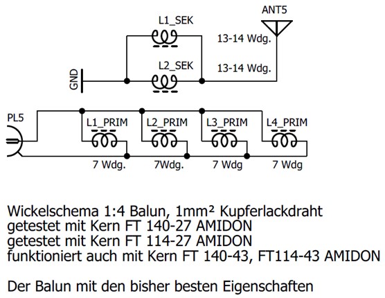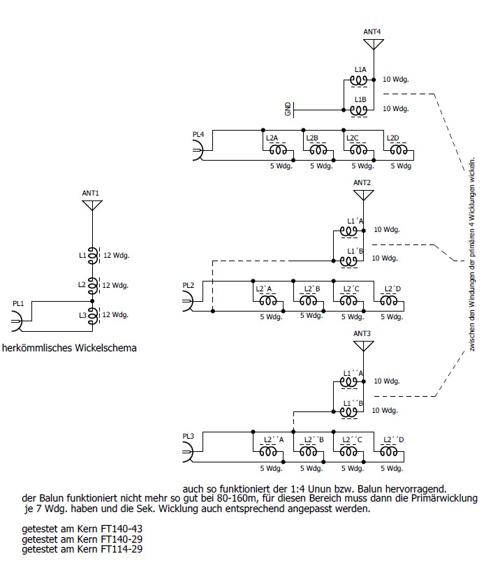Ich möchte das Thema aber noch einmal aufnehmen, weil ich inzwischen hochwertigeres Messequipment zur Verfügung habe. Die jetzigen Messungen bestätigen das bessere Übertragungsverhalten eines Baluns mit einer anderen Wickelmethode als bisher üblich. Ich fang noch einmal ganz von vorne an. Ein Balun besteht aus 2 Wicklungen, die Anzahl der Windungen zueinander bestimmt das Übersetzungsverhältnis. Üblicherweise werden die beiden Wicklungen ineinander gleichmäßig über dem Ferritkern verteilt. Meine Idee ist…um eine bessere Kopplung zwischen Primär und Sekundär-Wicklung zu erreichen die Primärwicklungen und Sekundärwicklungen mehrfach auszuführen und dann parallel zu schalten, um den Kern enger zu bewickeln um dadurch eine bessere Kopplung zu erreichen. Nachfolgende Bilder sollen das Wickelschema verdeutlichen.