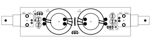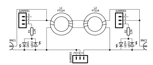 …jeweils mit unterschiedlichen Kernen und Wicklungsarten um einen schnellen Vergleich zu ermöglichen. Die Led´s sollten im Betrieb die visuelle Funktion unterstützen wurde aber nie richtig getestet. Das funktioniert auch erst bei etwas höherem Input. Die Leds sind mit einem Jumper abschaltbar. Außerdem gibt es einen weiteren Jumper der die Masse vom Primärkreis mit dem Sekundärkreis Verbindet bzw. trennt. Dieser Übertrager verhindert bei galvanischer Trennung (Jumper 3 geöffnet) Mantelströme auf dem Antennenkabel.