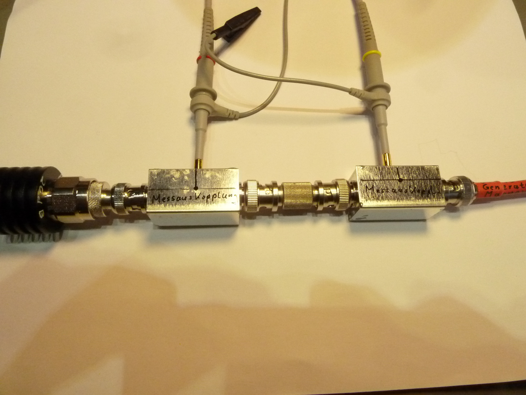 Erklärung der Bauteile von links nach rechts: Abschlusswiderstand 50 Ω, Messauskopplung hinter dem Prüfling, Prüfling, Messauskopplung vor dem Prüfling und das Kabel vom BodePlotter bzw.- Rauschgenerator.