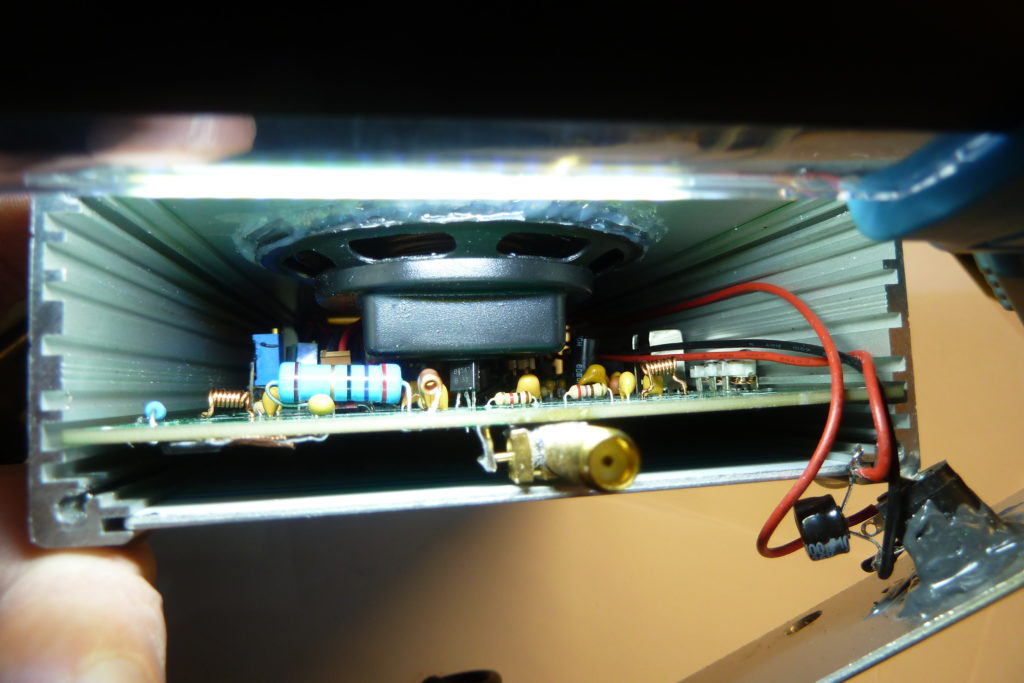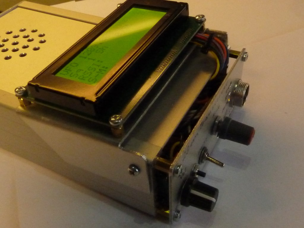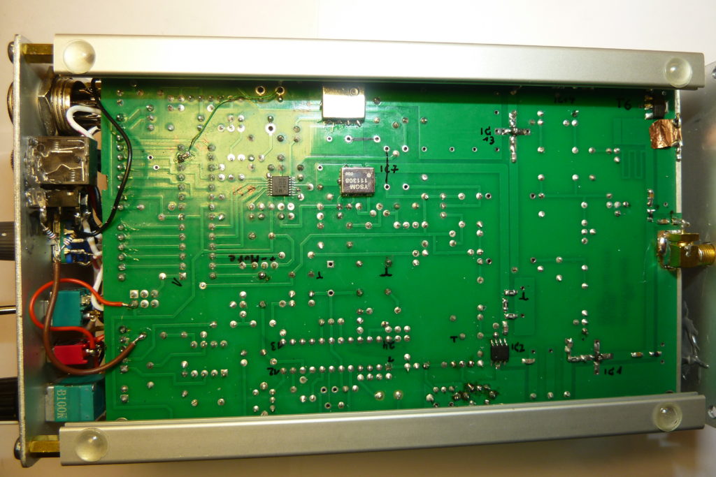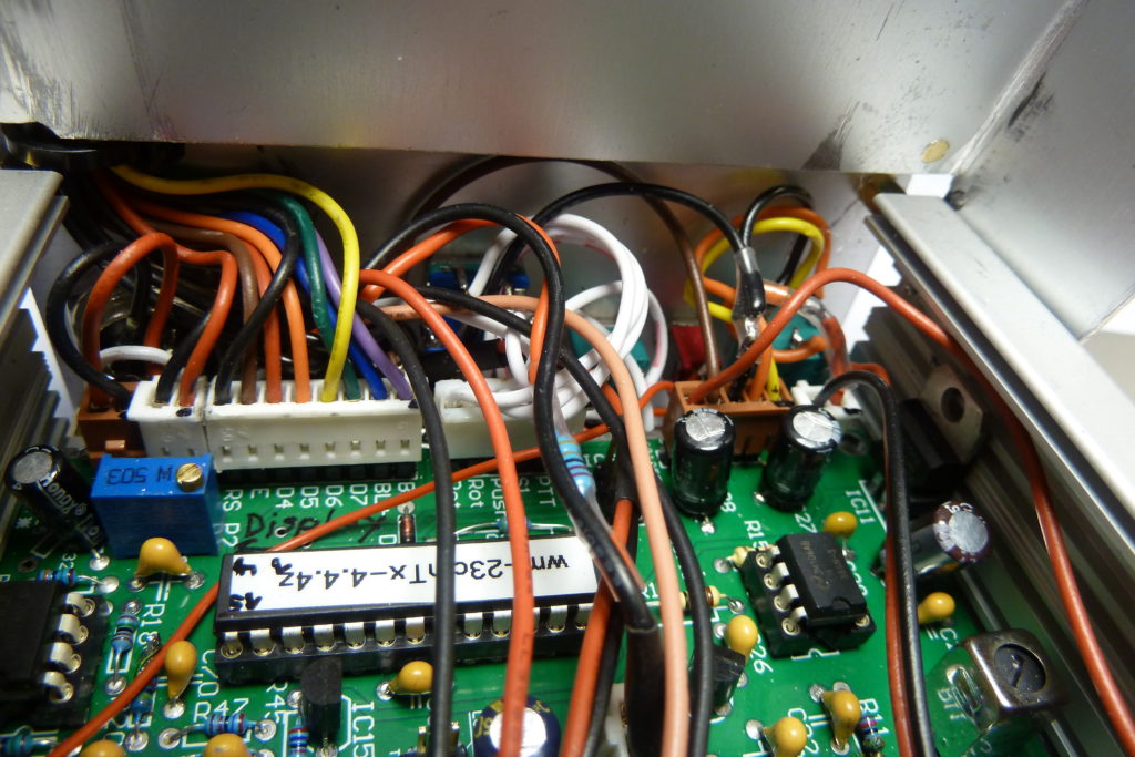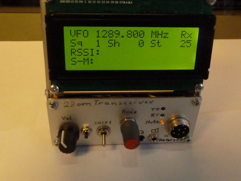…beim Clubtreffen wurden wir von Ingo DO6IL gefragt wer Interesse an einen 23cm Transceiver-Bausatz hätte, er würde in Kürze bestellen. Da das Zeugs aus Australien kommt würde es klug sein direkt mehrere dieser Bausätze zu bestellen. Ich brauchte nicht lange zu überlegen, Juchhuu wieder was zu basteln. Der Bausatz lässt sich problemlos zusammenbauen aber es gibt Besonderheiten. Man sollte schon Kenntnisse von Elektronik haben, eine ruhige Hand beim Löten der recht kleinen SMD-Bauteile, ein Multimeter um die Bauteile vor dem Einbau zu testen, sind Vorausstzungen. Hier fängt es schon an, es liegen mehr Bauteile dem Bausetz bei wie Platz dafür auf der Platine vorgesehen ist, das ist aber richtig so! Im Stromlaufplan ist ein Filter für den 1750Hz Ton gezeichnet welches auf der Platine nicht realisiert wurde, man tappt erst mal eine Zeit lang im Dunkeln. Hier muss man selber tätig werden. Es sind nur ein paar Bauteile zu verschalten das kann man freihändig machen…ich habe mich für eine kleine Platine entschieden. Der 1750 Hz Ton wird vom Prozessor zur Verfügung gestellt das ist unzulänglich dokumentiert, es gibt nämlich im Netz eine Beschreibung über unterschiedliche Versionen und da wechselt auch schon mal der Anschlusspin am Prozessor. Der Ton wird aktiviert indem man die PTT-Taste beim Senden kurz 2x betätigt, auch das ist schwierig in Erfahrung zu bringen, vielleicht wird das aber auch vorausgesetzt. Ich habe mich aber zusätzlich noch für einen externen 1750 Hz Generator mit Timer-IC NE555 (China) entschieden und das Layout für den 1750Hz-Filter um diesen Tongenerator erweitert. Ein Taster aktiviert bei Bedarf nun den Ton während ich sende. Parallel habe ich aber die Möglichkeit gelassen wie sie vom Entwickler vorgesehen war. Aber…in der Software kann man diese Funktion auch deaktivieren, und das ist etwas mühsam durch mehrere Menüs zu navigieren bis man diesen Menüpunkt gefunden hat. So bin ich mit dem externen 1750 Hz-Tongenerator flexibler. Ein Lautsprecher muss man selber dabei steuern. Auch habe ich alle Verbindungen die die Platine verlassen, dazu gehören u.a. Display, Drehgeber, Poti, Mikrofonbuchse, Leds steckbar gemacht. Die Pfostensteckverbinder wie sie auf dem Photo zum Bausatz abgebildet sind liegen nicht bei, hier ist „Reichelt“ gefragt. Die Bauanleitung beschreibt recht genau die Inbetriebnahme. Man sollte sich vielleicht vor der Bestellung die Anleitung aus dem Netz fischen um sicher zu stellen das man dem gewachsen ist. Mir hat es geholfen das ich einen Icom IC9700 als „Kontrollinstrument“ hatte. Alle Abgleicharbeiten funktionieren so wie beschrieben. Während des Aufbaus stellt man sich die Frage: „was ist das denn für ein Bauteil, ist das genau der Transistor der hier eingelötet werden muss“. In der Dokumentation gibt es für alle Bauteile das passende Datasheet…habe ich leider erst zu spät festgestellt, Grins! Ich habe die Platine (Europakarte 160 x 100 mm) in ein Gehäuse meiner Wahl (ProMa 131 020, Conrad) eingebaut. Das ist leider etwas zu kurz, ich habe mir geholfen das ich 10mm Abstandsbolzen zur Frontplatte verwendete. Anfangs war ich über diese Lösung nicht sehr glücklich, inzwischen habe ich mich aber damit abgefunden und finde es gut. Dem Bausetz liegt ein „riesiges“ Display bei. Ein kleines Gehäuse dafür zu finden ist nicht möglich, also wo hin mit dem Display. Ich habe das Display ausgelagert und kippbar gemacht, sieht nicht so elegant aus ist aber extrem praktisch. Der Transceiver kann jetzt vor mir auf dem Werktisch liegen oder im Regal stehen, immer ist eine gut ablesbare Anzeige möglich. Ach ja Display…das ist meiner Meinung nach viel zu hell. Ein Vorwiderstand von 130 Ohm am Display-Lötpunkt „BLK“ brachte eine erträgliche Helligkeit. Ich habe mich für eine 8 polige Mikrofonbuchse entschieden wie sie von Icom und Kenwood benutzt wird. Und beide Schaltungsvarianten habe ich an die Buchse angeschlossen und die vertragen sich. Nun kann ich wahlweise mit den beiden Mikrofonen arbeiten. Ich darf aber nur ausschließlich den individuellen Mikrofonanschluss und die PTT-Taste an der 8 poligen Mikrofonbuchse realisieren, kein Lautsprecher oder andere Mikrofontasten wie UP-Down verschalten. Die kleine Filterplatine für den 1750 Hz Tonruf habe ich hochkant auf der Hauptplatine befestigt, da ist ausreichend Platz vorhanden. Dazu entferne ich mit einem Glasborsten-Radierer etwas Farbe an geeigneter Stelle von der Platine und löte dann Stützpunke auf die Kupferfläche auf. Ich wollte auf jeden Fall eine TX-Led und eine RX-Led, dafür habe ich 2 polige Pfostensteckverbinder auf die Platine geklebt und entsprechend verdrahtet.
