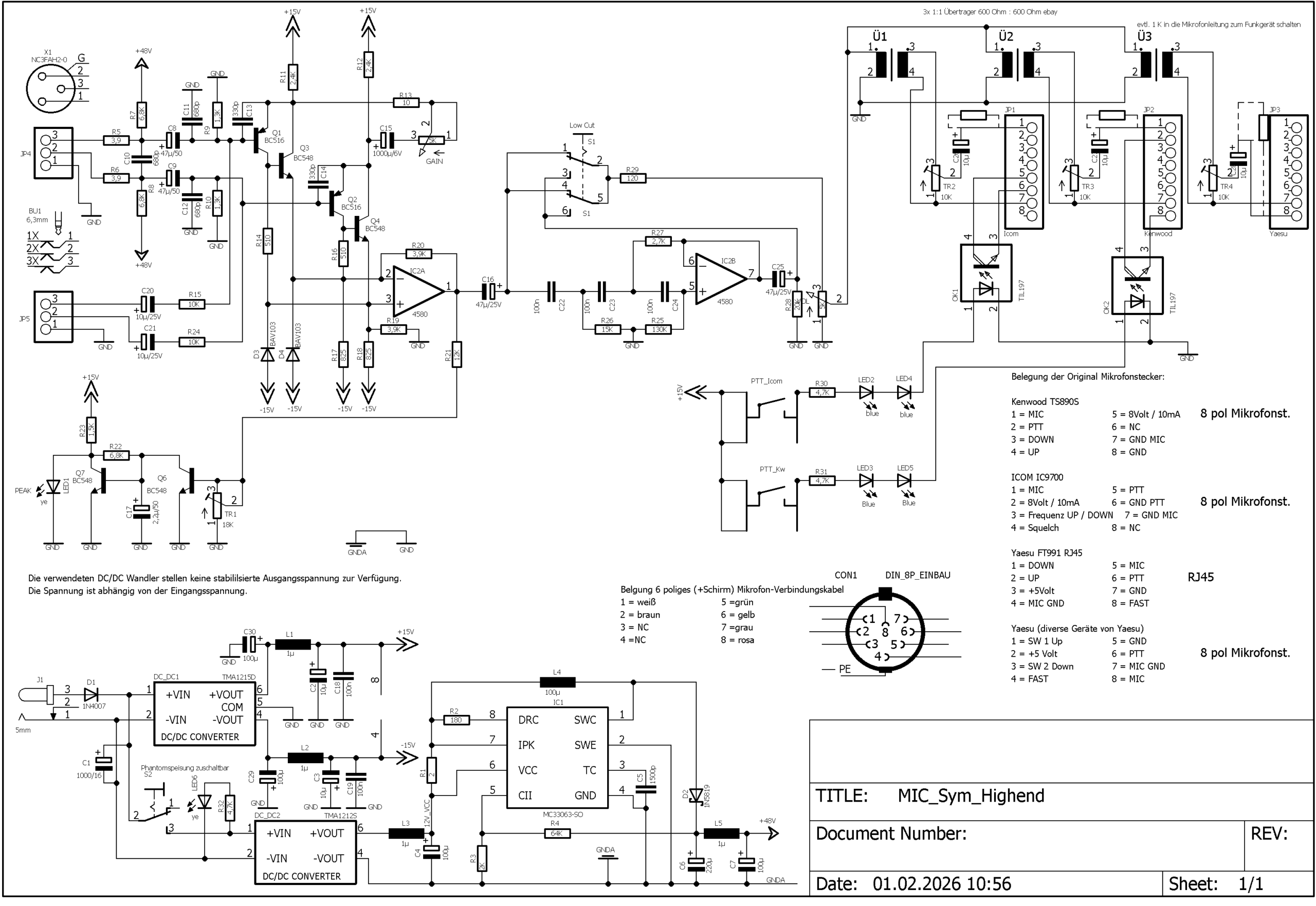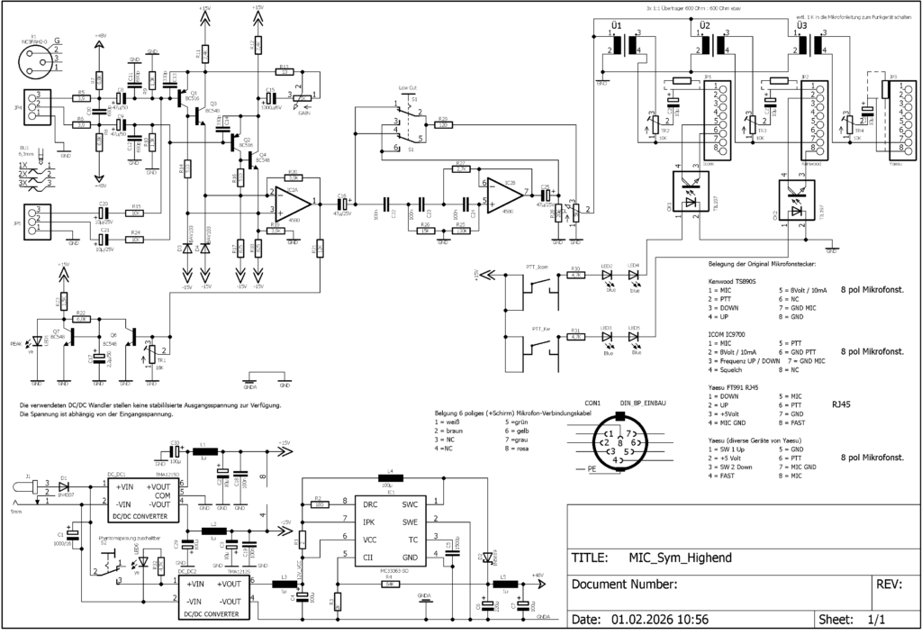 …braucht man so ein Testgerät?…eher nicht…eventuell doch…mir war einfach danach! Ich habe Stationsgeräte von Kenwood und Icom. Das eine hat eine dynamische Kapsel, das andere eine Elektret-Kapsel. Es wäre doch gar nicht schlecht wenn man die Mikrofone im direkten Vergleich auf ihre Audioeigenschaften testen könnte. Mach das Sinn…hmmm…am Funkgerät funktionieren sie ja prima. Und wenn ich dann doch so ein Test-Gerätchen baue dann sollte man auch direkt die PTT-Funktion mit testen können. Gesagt…getan Jedes Mikrofon hat seine individuelle Pin-Belegung, aber alle haben den 8-poligen Stecker. Also wurden drei gleiche Verstärkerzüge vorgesehen. Im Gerät gibt es dann 3 Stück 8 polige Steckerleisten (Reichelt) die alle die gleiche Belegung haben. Von hier aus wird individuell die Beschaltung der Mikrofonstecker vorgenommen. So können auch Mikrofon-Varianten unterschiedlichen Typs später nach-umgerüstet werden. Es wurde jedem Mikrofon einen VV und ein Poti spendiert um die abweichenden Empfindlichkeiten untereinander anzupassen. Eine zu schaltbare BIAS-Stromversorgung für Elektret-Mikrofone wurde auch berücksichtigt. Drei günstige Mikrofon-VV-Module wurden im Internet besorgt. Ein Kopfhörer-Verstärker-Modul muss auch noch rein…darüber und einem Kopfhörer findet der Vergleich statt. Leds signalisieren die funktionierende PTT. Die Mikrofone sind sofort aktiv wenn man sie anschließt, PTT drücken ist nicht notwendig. Was habe ich festgestellt. Der Selbstbau hat sich für mich gelohnt…die Mikrofone klingen alle sehr unterschiedlich. Aber an sich ist das ja egal, sie wurden ja individuell für den passenden Transceiver entwickelt. Aber alle klangen in ihrem Frequenzbereich eingeengt, das eine eher dumpf, das andere nicht linear, das M1 von Yaesu hat mich am meisten überrascht…einfach nur nichtsagend, unauffällig flach. Mir kam eine Idee…wie klingen Studiomikrofone am Transceiver, also diese hochwertigen Kondensator-Mikrofone mit 48 Volt-Phantomspeisung wie sie im Tonstudio benutzt werden. Solche Mikrofone habe ich noch, ich habe mich eine Zeit lang mit Bühnen-Beschallungen beschäftigt. Also muss noch ein hochwertiger Mikrofon-Vorverstärker her wie er in besseren Mischpulten Anwendung findet… Juchhuuh…nächstes Bastelobjekt! Davon werde ich hier auch berichten. Um es vorweg zu sagen, diese Großmembran-Kondensator-Mikrofone (habe mehrere getestet) klingen so viel besser, also luftiger, ehrlicher, dynamischer das man sich fragt wie klingt so ein Mikro am Transceiver. …ich habe es nie getestet, mir wurde etwas der Spaß genommen. Zur Geschichte:…ich bin der einzige im Club der schon mal Selbstgebasteltes mitbringt und davon gibt es einiges. Oft kreisen diese Gerätchen in der Runde um dann nach wenigen Minuten wieder vor mir zu liegen. Ich kenn das schon. Keiner fragt mich mal „…was soll das“, oder „Super hätte ich auch gerne“. Aber ich höre nicht auf damit, denn inzwischen erwarte ich jedes Mal genau diese Reaktion, das amüsiert mich extrem. Ob es Sinn macht so ein Edel-Mikro am Transceiver zu betreiben habe ich mal bewusst im Club angesprochen. Ich hatte dazu einen Testaufbau mitgebracht und jeder konnte die unterschiedlichen Mikrofone testen dazu brauchte man sich nur den Kopfhörer aufsetzen. Ein OM hat gar nicht erst den Kopfhörer aufgesetzt: „das spielt keine Rolle“ war seine Antwort. Ja, vielleicht hat er Recht. Also beschloss ich den Test meines Super-Mikrofonvorverstärkers nicht mit diesen Kollegen zu machen. Seitdem verstaubt das Gerätchen einsatzbereit an meiner Station. Andere OMs wollte ich auch nicht quälen und zwingen an einer Mikrofon-Test-Challenge teilzunehmen. Ich habe eine ganze Menge gelernt, aber Spaß hat es auf jeden Fall gemacht.